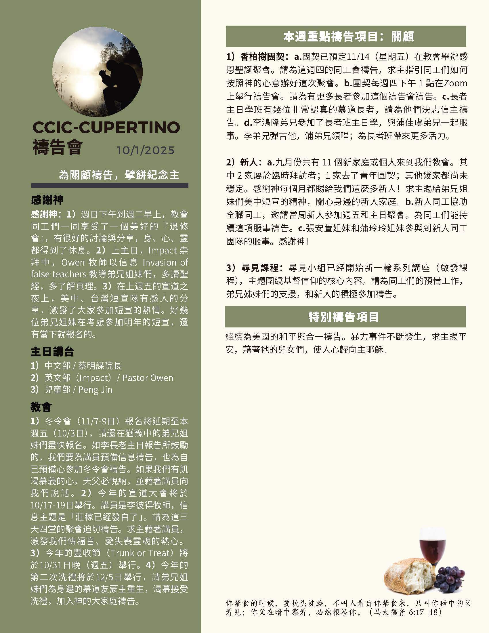 今晚,教會的禱告會將為關顧禱告,也擘餅紀念主。期待弟兄姐妹們來參加!